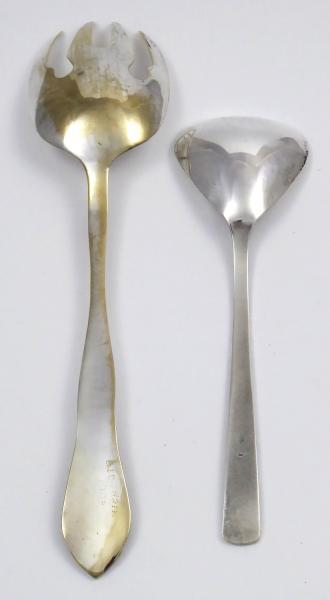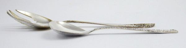 Postříbřený kov (alpaka). Celková hmotnost 134,7 g. Překládací příbor složený z vidlice a lžíce na přílohy či salát z postříbřeného kovu. Rukojeti po celé délce zdobeny reliéfními florálními motivy. Značeno: čísla a značka výrobců. Střední Evropa a Sovětský Svaz, polovina minulého století. Délka překládací vidlice 26,5 cm, délka překládací lžíce 20 cm.