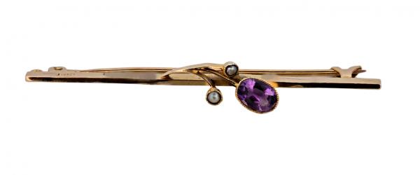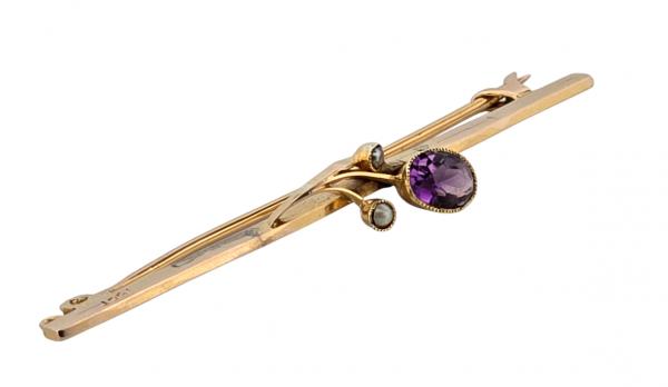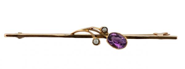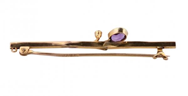 Starožitnost: Zlatá brož s ametystem a perličkami
