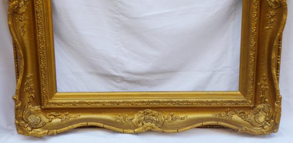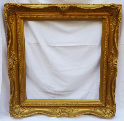 Dřevo se zlatavě bronzovou patinou. Světlost 75 cm x 70 cm. Luxusní rám francouzského typu blondel s klenutou obloukovitě tvarovanou čelní stranou zdobenou velkými reliéfními ornamenty. Vnitřní odstupňovaná lišta zdobená ornamentem mušle. Evropa 1880 - 1910. Celkový rozměr 106 cm x 100 cm.
