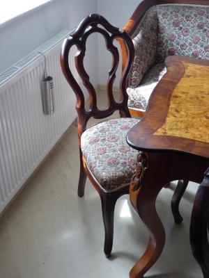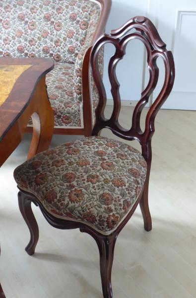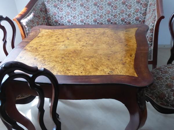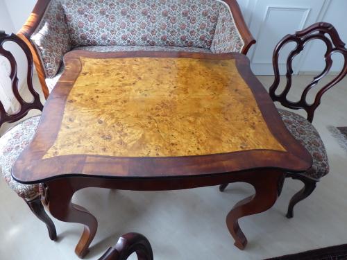 Světlá a tmavá dýha, kořenice, světlý masiv. Stůl z období pozdního biedermeieru s tmavší dýhou, čtvercovou profilovanou horní deskou se světlou kořenicovou dýhou. Esovitě tvarované nohy zdobené řezbou. Tři židle z období Louis - Philippe v mahagonové barevnosti s elegantně tvarovanou a členěnou opěrnou částí. Čalouněné. Sofa, pohovka, ve stylu druhého biedermeieru z přelomu 19. a 20. stolet jako dárek ke stolu s židlemi. Střední Evropa 1850 - 1900. Rozměr stolu 76,5 cm x 98 cm x 84,5 cm. Výška židlí 97 cm, výška sedáku židlí 50 cm, hloubka 49 cm.