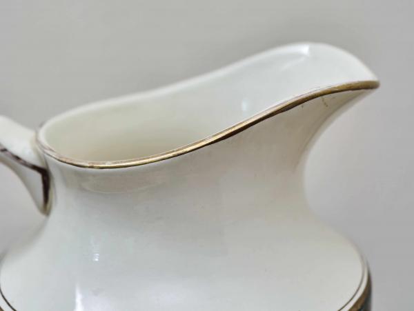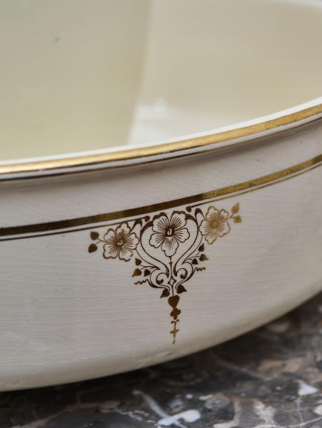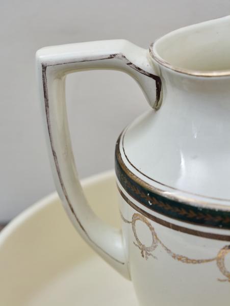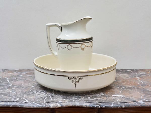 Dvoudílná keramická mycí souprava značky Villeroy & Boch, La Louvière, vyrobená v Belgii v první polovině 20. století. Sada se skládá z velké mísy a džbánu se zlatým a zeleným dekorem s jemnými ornamenty. Set je označen původní tovární značkou Boch Frères La Louvière – Made in Belgium – Fabrication Belge.