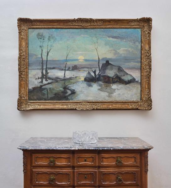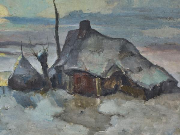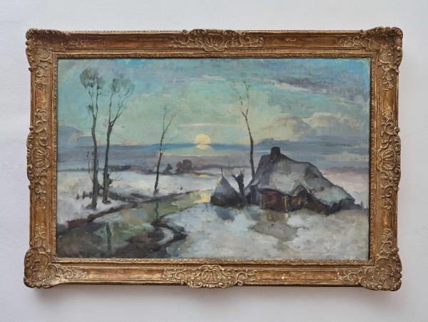 Olejomalba na plátně zachycující zimní krajinu se zasněženou chalupou při západu nebo východu slunce. Scéna působí klidně až melancholicky, s jemnými přechody studených odstínů modré, šedé a bílé. Kompozice s říčkou a stromy v popředí vytváří příjemnou hloubku a atmosféru tiché zimní vesnice. Obraz je zasazen do původního, bohatě zdobeného zlaceného rámu s reliéfní ornamentikou.
