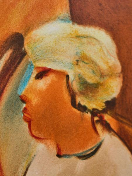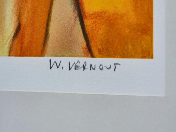 Barevná litografie belgického malíře Warda Lernouta, signovaná vpravo dole tužkou a označená zkušebním tiskem EA (Épreuve d’Artiste). Typicky expresivní figurální kompozice s venkovským námětem, charakteristická pro Lernoutovu tvorbu – teplé tóny, dynamické tahy a stylizované postavy. Ward Lernout (*1931, † 21.12.2019 Belgie) byl významný belgický malíř a grafik, jehož tvorba se vyznačuje expresivním rukopisem, teplou barevností a silným emocionálním výrazem. Patřil mezi uznávané představitele současného vlámského výtvarného umění.