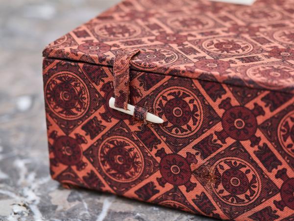 Součástí je původní látková dárková krabice s tradičním japonským vzorem a nápisem 景徳鎮名瓷 (Jingdezhen Meici – slavný porcelán z Jingdezhen), což odkazuje na vysoce kvalitní výrobu porcelánu podle čínských vzorů.