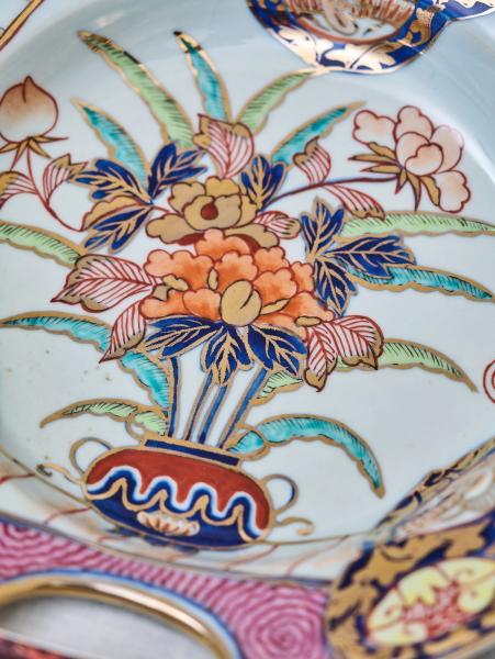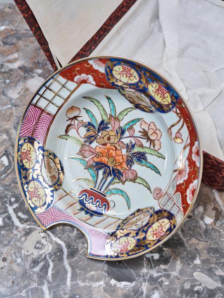 Ručně malovaný japonský porcelánový talíř Imari, původně určený jako holicí miska. Charakteristický výřez na okraji sloužil k pohodlnému přiložení k bradě během holení. Dekor je proveden v typických barvách Imari – červené, kobaltově modré, tyrkysové a zlaté, s motivem kytice ve váze a bohatým ornamentem po obvodu.