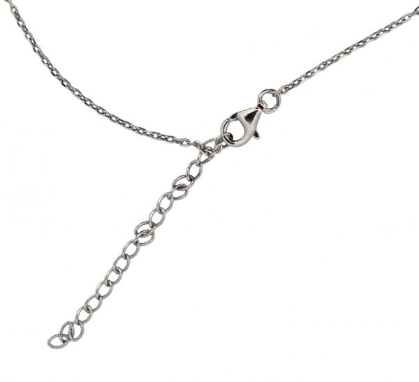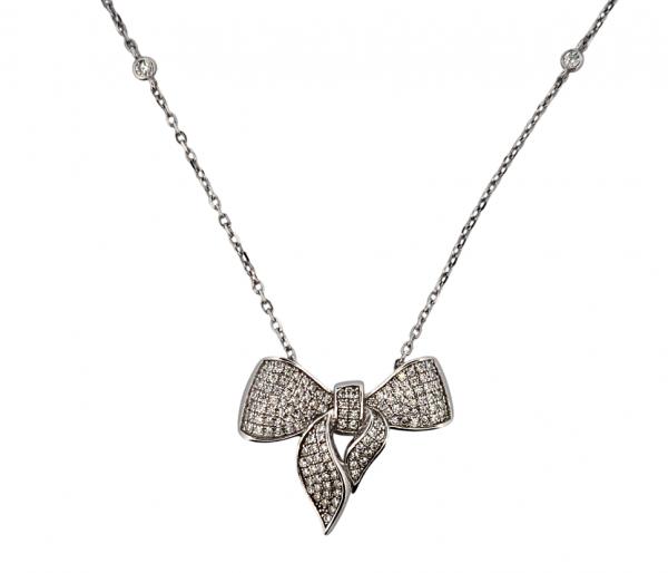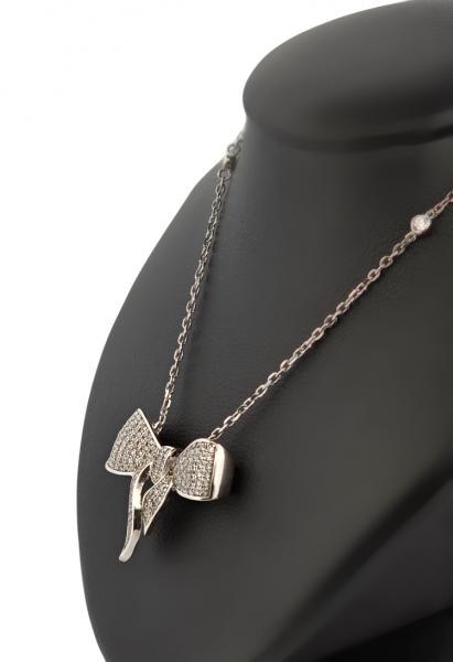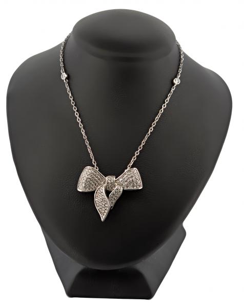 Popis: Stříbrný náhrdelník ve tvaru propracované mašličky, vykladáné čirými zirkony. Na řetízku další dva ozdobné zirkony. Zapínání na karabinu. Délka variabilní.