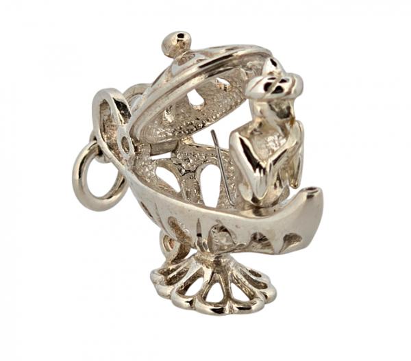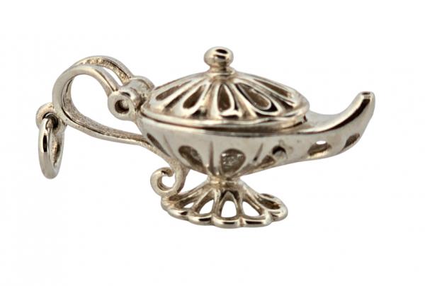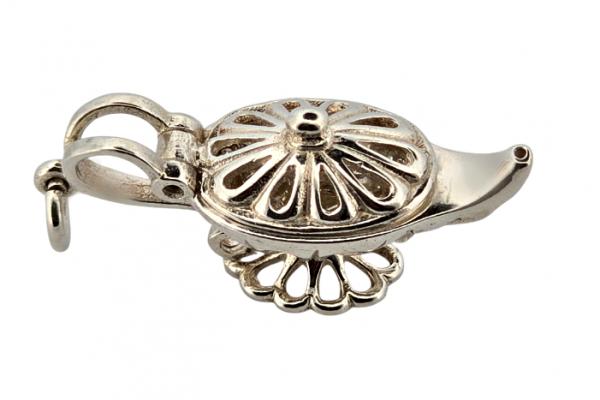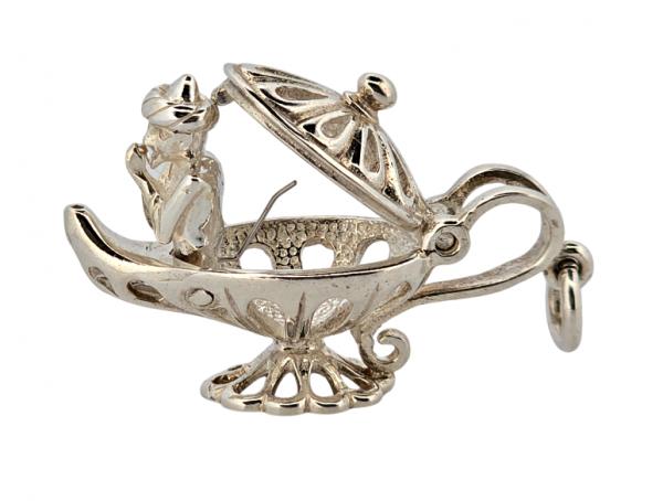Popis: Unikátní stříbrný přívěsek s řetízkem ve tvaru detailně propracované Aladinovi kouzelné lampy. Lampa je opatřena speciálním mechanismem a po zvednutí víčka vyskočí Aladin, kterého lze zase mechanicky jednoduše zasunout zpět a lampu zavřít.