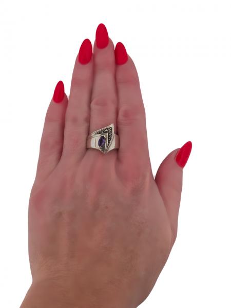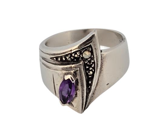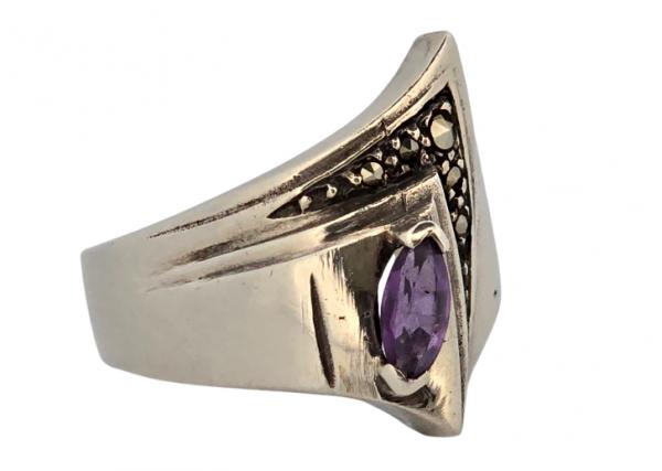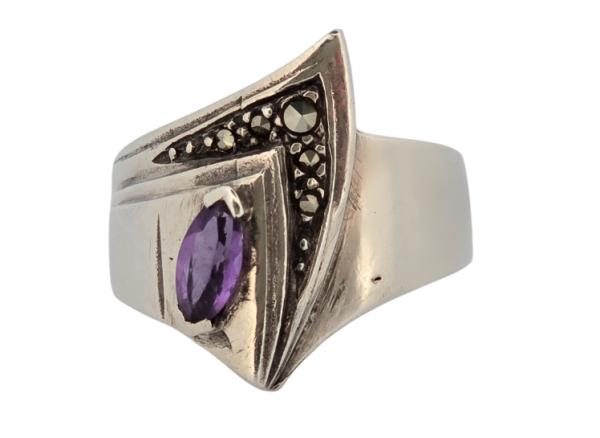 Popis: Výjimečný starožitný stříbrný prsten Art Deco, autorská tvorba, netradiční design. Zdobený centrálním fialovým ametystem a markazity.