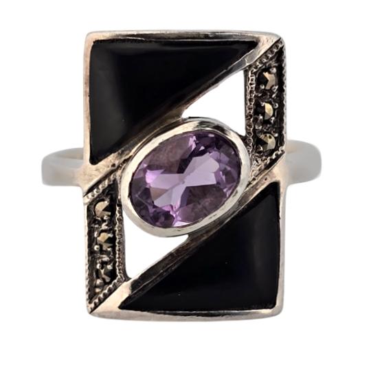Popis: Starožitný stříbrný prsten s ametystem, vykládaný markazity a zdobený černým emailem. Designový šperk.