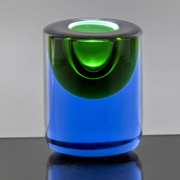 Vázička, 1963, sklo modré se zeleným jádrem, hutně tvarované, zhotoveno ve sklárně Mstišov, výška 13 cm, průměr 10,5 cm, přiložen prospekt autora s fotografií této vázy, Provenience: pozůstalost autora