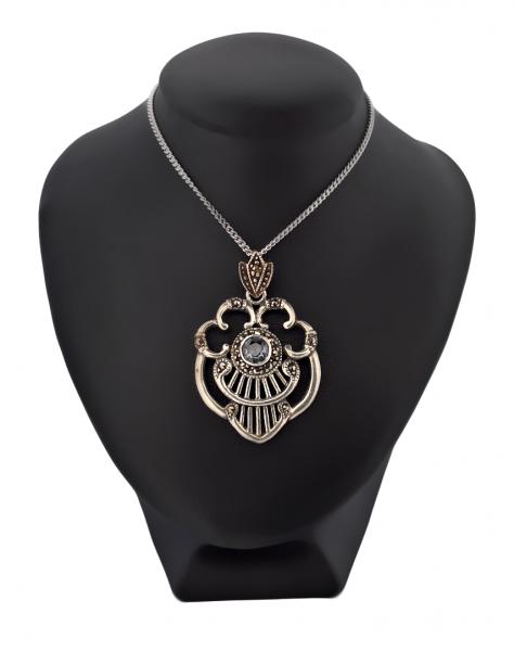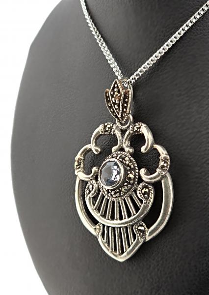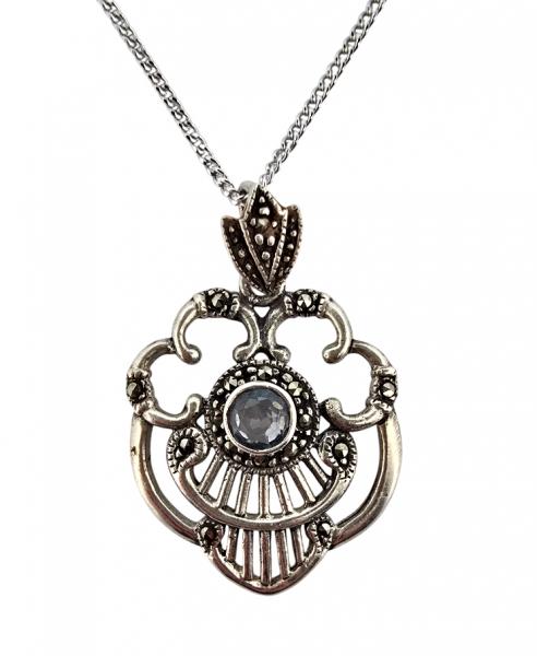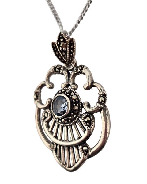 Popis: Stříbrný starožitný art deco náhrdelník (přívěs a řetízek), s typickými art deco tvary, zdobený markazity a centrálním světle modrým syntetickým spinelem. Zapínání klasické - funkční.
