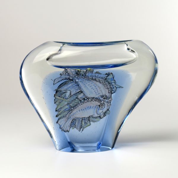 Váza s motivem ryb, 60. léta 20. století, autorská práce, zhotoveno v Novoborských sklárnách, sklo akvamarínově modré, zatavený dekor ryb, hutně tvarováno, výška 13,5 cm