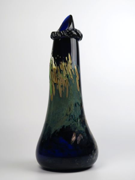 Vysoká váza, autorská práce, unikát, získáno z pozůstalosti autora, sklo kobaltové modré, foukané, obalované v pestré sklovině, výška 51 cm