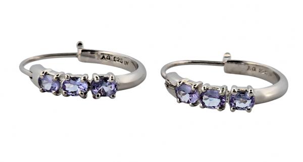 Popis: Stříbrné náušnice kroužky vykládané přírodními tanzanity. Na každé náušnici jsou tři kusy tanzanitu oválného tvaru, o celkové váze cca 0,96 ct. Zapínání tzv. francouzský zámek, plně funkční.