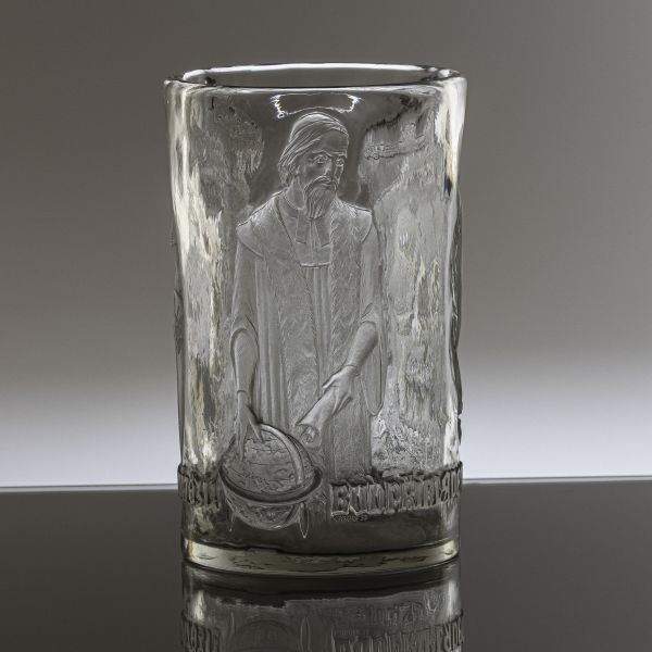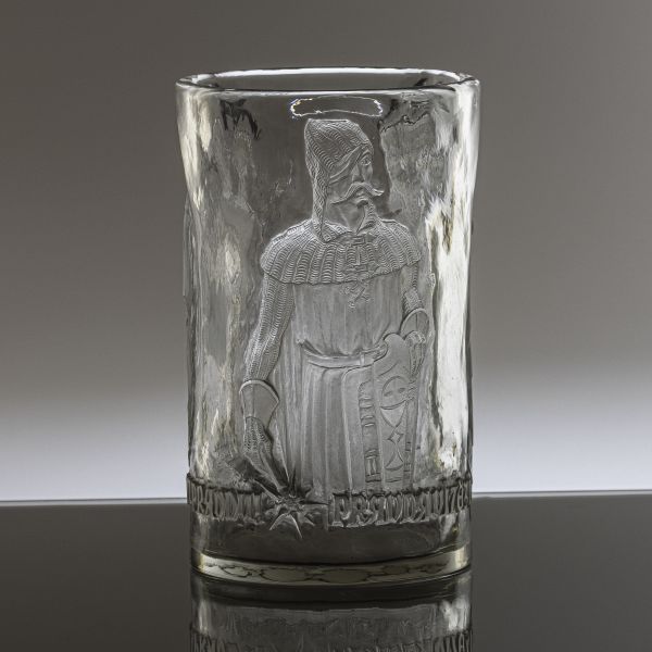 Váza "Pravda vítězí", 1953, sklo čiré, reliéfně řezané figurální motivy, J. A. Komenský - Buď příkladem; Jan Hus - Miluj pravdu; Jan Žižka - Pravda vítězí, signováno K. Bischof 53, výška 23,5 cm, Kurt Bischof - významný řezáč skla, studia na sklářské škole v Novém Boru a u otce Augusta Bischofa jr., pracoval pro Stefana Ratha, J. & L. Lobmeyr, po emigraci v roce 1965 pracuje ve sklárně Rheinbach v Německu