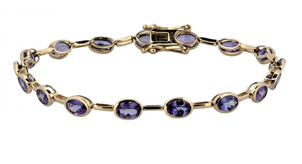 Popis: Luxusní zlatý náramek s přírodními tanzanity. Tanzanity díky své jedinečnosti vzrůstají enormně na hodnotě. Vynikají svojí jasnou modro fialovou barvou. Na náramku je celkem 17 kusů přírodních tanzanitů smíšeného brusu, kvality velmi dobré dobré, o celkové váze cca 6,8 ct. Náramek má dvojité bezpečnostní zapínání. Jedná se o luxusní šperk, velmi výjimečný a vhodný také jako investice.