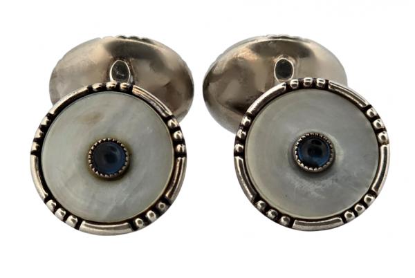 Popis: Stříbrné starožitné secesní manžetové knoflíčky, oboustranné, deailně propracované. Zdobené přírodní lesklou perletí a modrým kabošonošem safírového skla. Jedná se o výjimečný šperk netradičního designu.