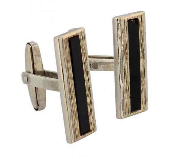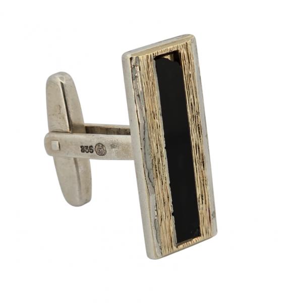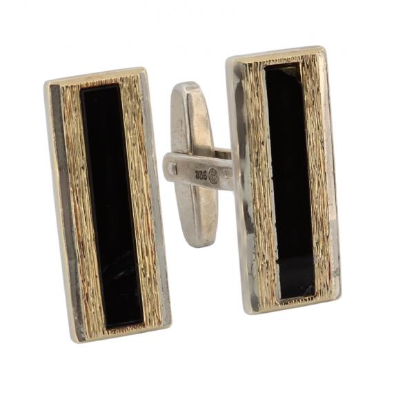 Popis: Stříbrné manžetové knoflíčky, zdobené jemným zlaceným prolamováním a černým proužkem přírodního onyxu. Na jednom knoflíčku lehce vyštíplý růžek onyxu. Plně funkční.