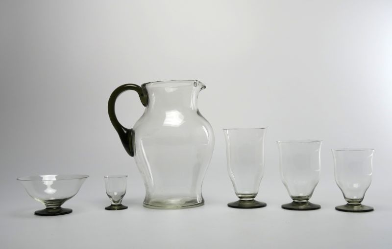 30. léta 20. století, Čechy, ve stylu Družstevní práce, celkem 31 kusů, obsahuje: džbán (výška 21 cm), 6 misek na sekt (výška 6 cm, 6 odlivek na pálenku (výška 5 cm), 6 pohárků na víno (výška 9,5 cm), 6 číšek na vodu (výška 10,5 cm), 6 číšek na pivo (výška 12,5 cm), sklo čiré, a šedé, jedna odlivka na pálenku lepená