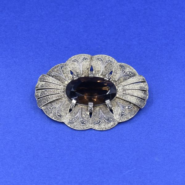 925/1000, v. 19,95 g, Theodor Fahrner, Pforzheim, kolem 1930, vsazené hnědé sklo a markazity, značeno FAHRNER, 45 x 28 mm, čs. punc