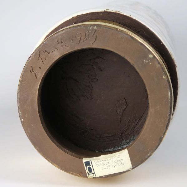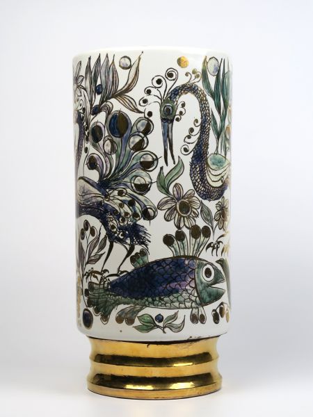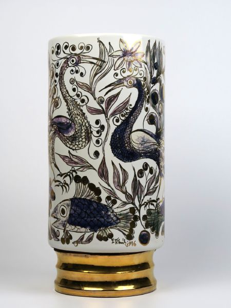 Velká váza "Mořský svět", 1985, pálená hlína, glazovaná zlacená základna, podglazurně malovaný a zlacený motiv mořského světa, signováno a datováno v glazuře a na základně, prodejní štítek z Díla s cenovkou 3.350 Kč, vlasová trhlina na dně, výška 40 cm