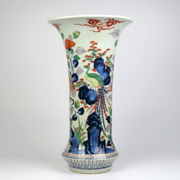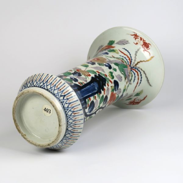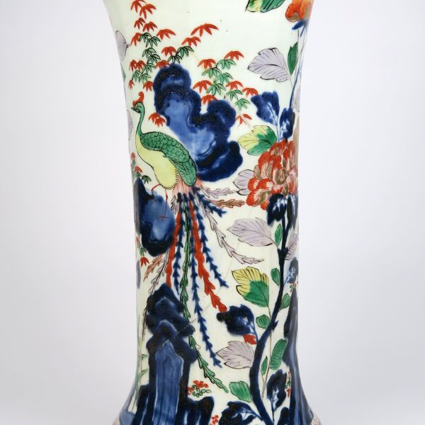 18. století, Japonsko, Arita, porcelán, malován pestrými emaily, motiv bájného ptáka na skalisku, vlasová trhlina, výška 45 cm