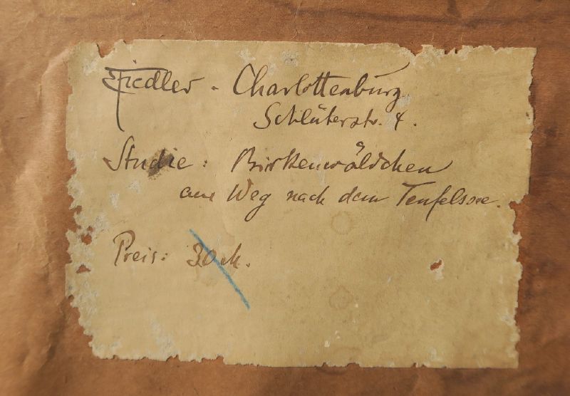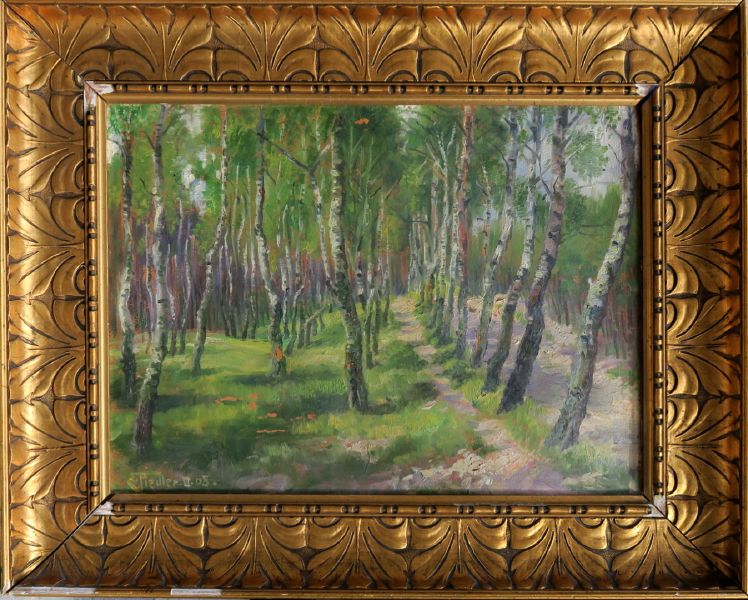Březový háj, 1908, olej/karton, signováno a datováno vlevo dole E. Fiedler 08, 31 x 42 cm, na zadní straně popsáno "Studie: Birkenwäldchen auf der Weg nach Teufelsee", rám, lehce poškozená malba a rám