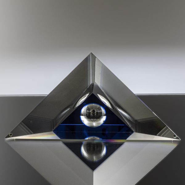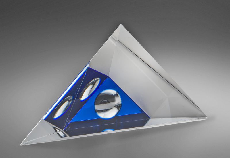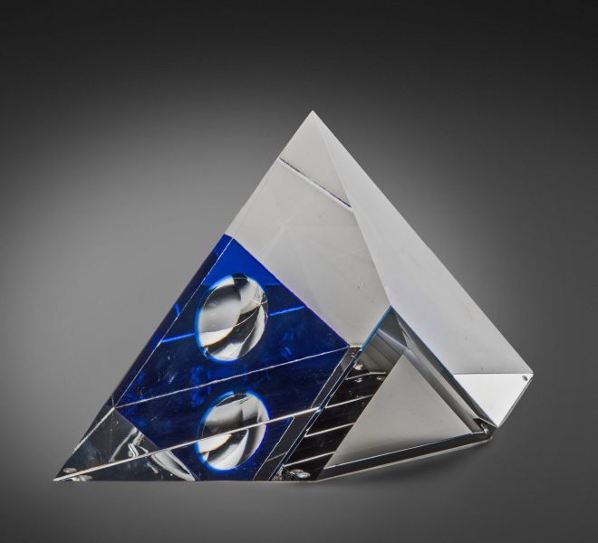 Objekt, 2005, autorská práce, unikát, monogramováno JF 05, sklo čiré optické a kobaltové, broušené, lepené, výška 19 cm, šířka 36,5 cm