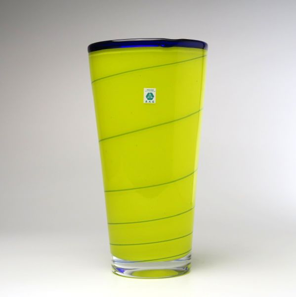 Váza "Rony", návrh 1994, model č. 94 079 17 10, zhotoveno ve sklárně B. A. G. Vsetín, sklo žluté, zatavená modrá spirála značeno etiketou B. A. G. , rytá značka Design R. Plesl, lit.: Firemní katalog B. A. G. , 2001, výška 26 cm