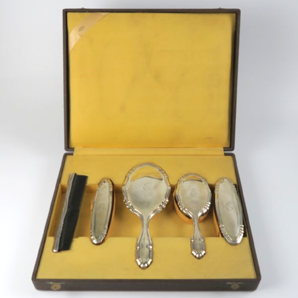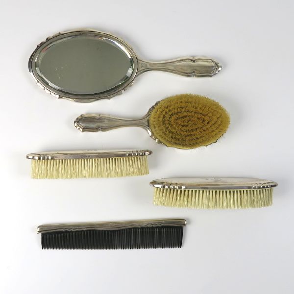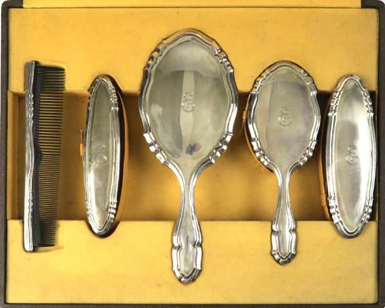 30. léta 20. století, stříbro, 800/1000, v. btto 789,30 g obsahuje 3 kartáče, zrcátko a hřeben, rytý monogram E, původní etue značená prodejcem Goldschmidt Prague (42 x 34 cm), čs. punc 1929 - 1941, mistrovská značka FB, výdajová boleta PÚ s odhadnutou hmotností stříbra 389,30 g, perfektní, nepoužitý stav