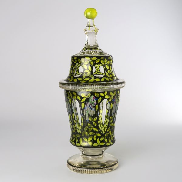 kolem 1920, Nový Bor, sklo čiré, medová lazura, ornamentální dekor malovaný černí, transparentními pestrými emaily malovaní papoušci, výška 28,5 cm