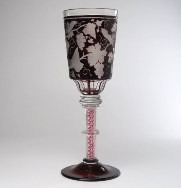 50. léta 19. století, Harrachovské sklárny, Nový Svět, sklo čiré, základna z rubínového skla, válcový dřík se zatavenu barevnou spirálou, kupa vrstvená rubínem, řezaný motiv větévky vinné révy, výška 31 cm