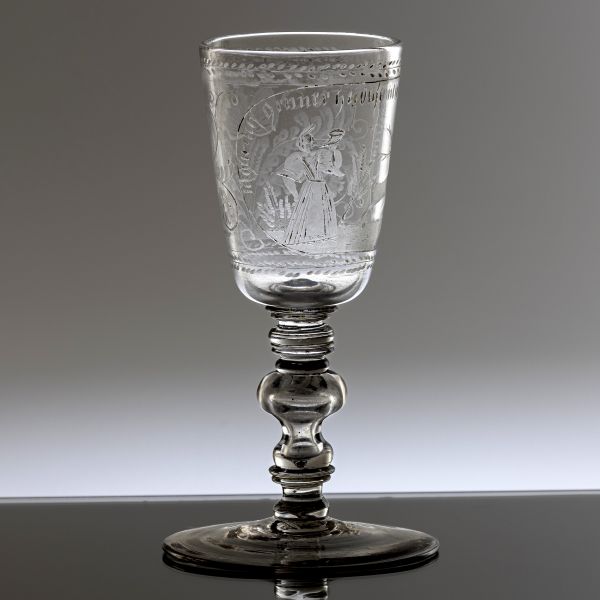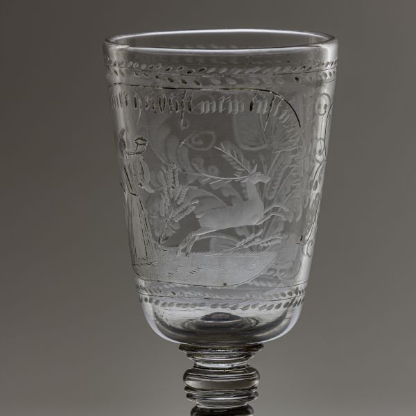 1. čtvrtina 18. století, Čechy, sklo čiré, řezané, balustrový dutý dřík, na kupě řezaný oválný medailon s motivem lovce s jelínkem a německým nápisem, na zadní straně řezaná kytice, výška 24 cm