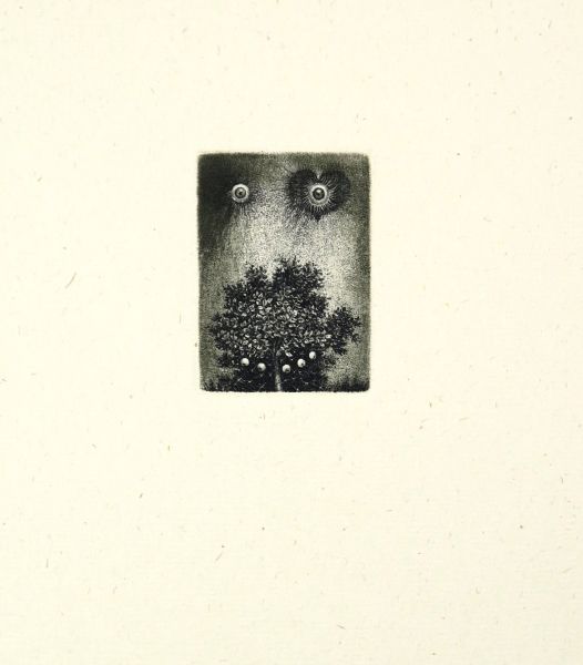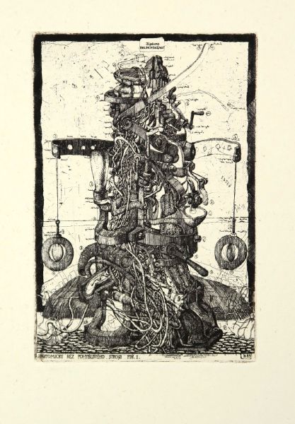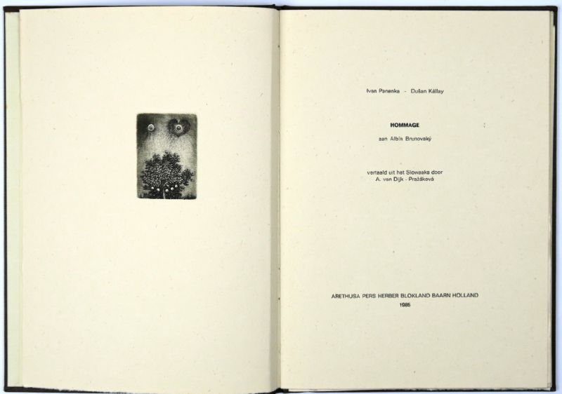 Hommage a Albín Brunovský, 1985, č. 3/10, bibliofilie, 26,5 x 19 cm, obsahuje vevázané tři lepty: lept Albína Brunovského (56 x 40 mm), který autor vytvořil v roce 1984 u příležitosti jubilea autora textu knihy Ivana Panenky a dva lepty Dušana Kállaye - Anatomický řez pohyblivého straja fig. I. a II. (155 x 105 mm), shodné tři listy volně vloženy, autor textu: Ivan Panenka (1934-2013). Grafická úprava: Dušan Kállay (1948). Vydalo nakladatelství: Arethusa Pers Herber Blokland, Baarn, Holand u příležitosti 50. narozenin Albína Brunovského, perfektní stav