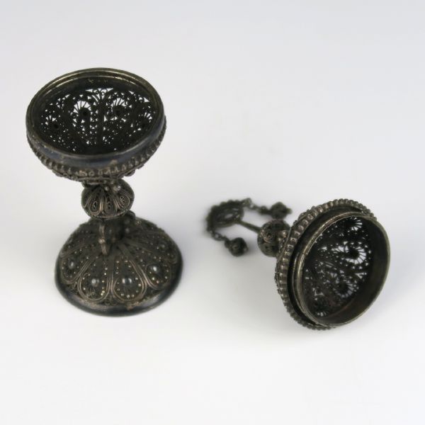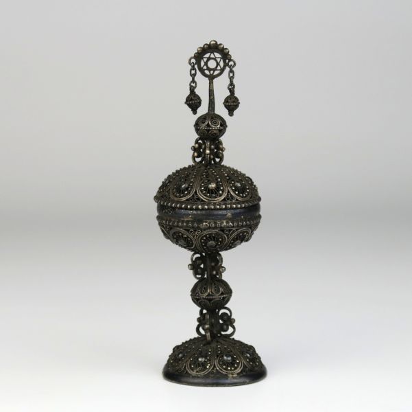 před 1900 - 1920, stříbro, 925/1000, v. 65,35 g, filigránové provedení, šroubovací horní díl, zhotoveno v dílnách Bezalel (založil Boris Schatz), pražský dovozový punc 1902 - 1920, výška 12 cm