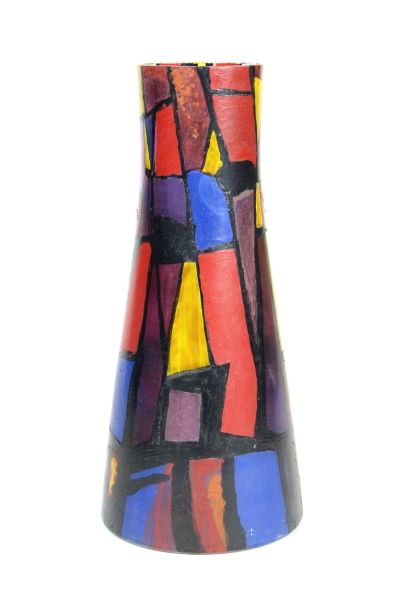 Váza Malá katedrála, 1959, unikát, autorská práce, sklo čiré, malované transparentními a emailovými barvami, výška 30 cm, Ref.: Potvrzeno synem autora. Lit.: Glass Review. 1961, sv. 16, č. 5, s. 143-147, obr. na s. 144