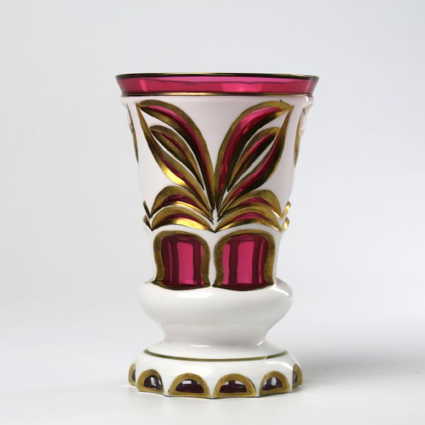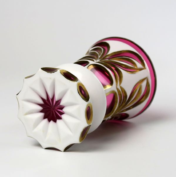 Čechy, pravděpodobně Harrachovské sklárny, 2. polovina 19. století, sklo rozalínové, vrstvené opálovým, probrušovaný dekor, zlaceno, výška 12,5 cm