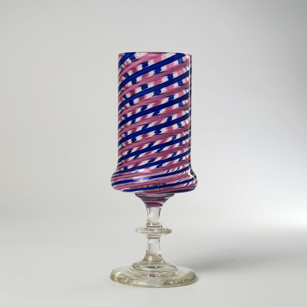Harrachovské sklárny, 2. polovina 19. století, sklo čiré, zatavená spirála z modré a růžové skloviny, výška 18 cm