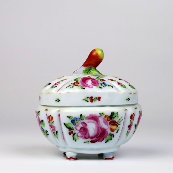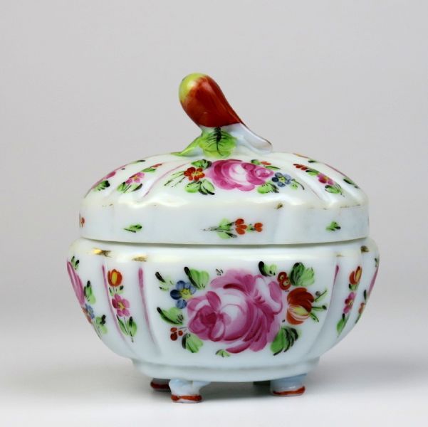 Čechy, konec 18. století, sklo mléčné, pestře malované květy, výška 14 cm, šířka 13 cm