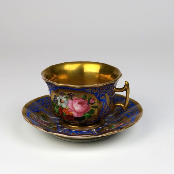 40. léta 19. století, Slavkov/Březová, porcelán, modrý fond, zlaceno, pestrá malba květů, vtlačená značka S nebo FR, vlasová trhlina na misce, průměr misky 14,5 cm, výška 6 cm