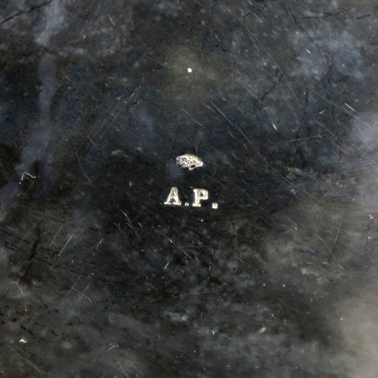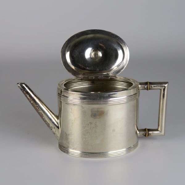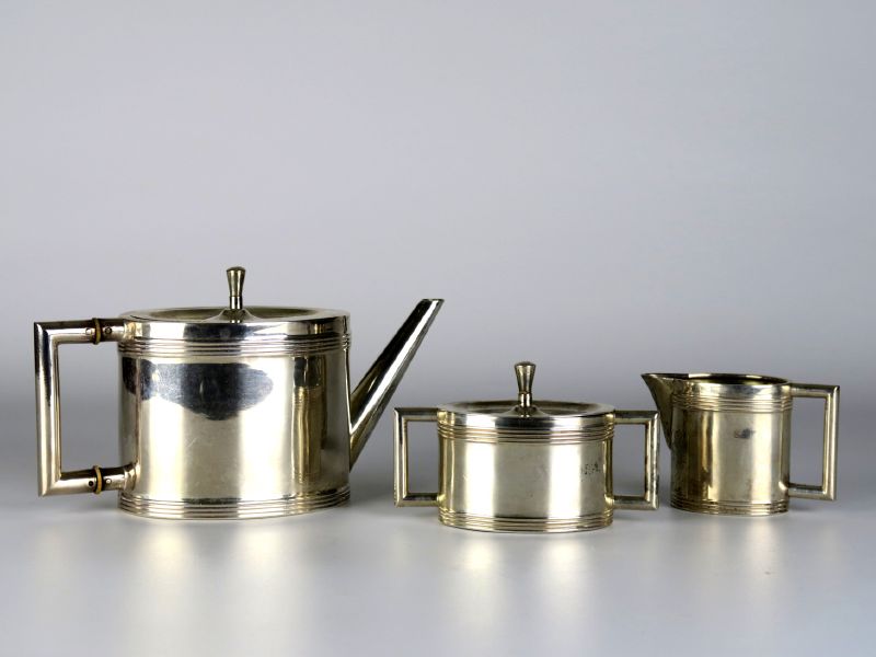800/1000, v. 555,10 g, střední Evropa, kolem 1910, obsahuje konvičku s víčkem na stěžejce (v. 11 cm), cukřenku s víčkem (v. 7 cm) a mléčenku (v. 6 cm), pražský dovozový punc 1902 - 1920, zn. A. P.