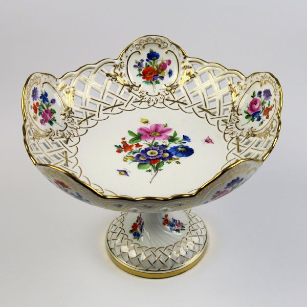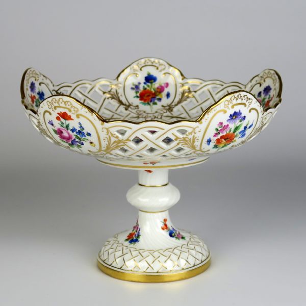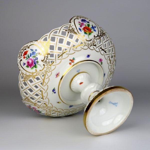 konec 19. století, Míšeň, porcelán, pestře malované květy, zlaceno, modrá znaačka mečů pod glazurou, průměr mísy 22,5 cm, výška 17 cm