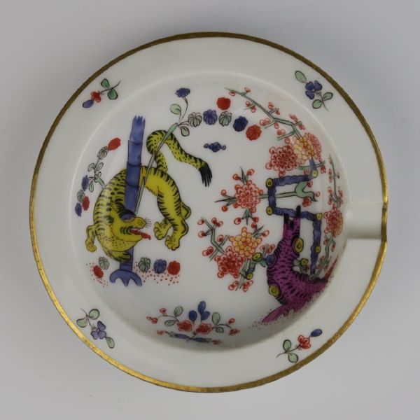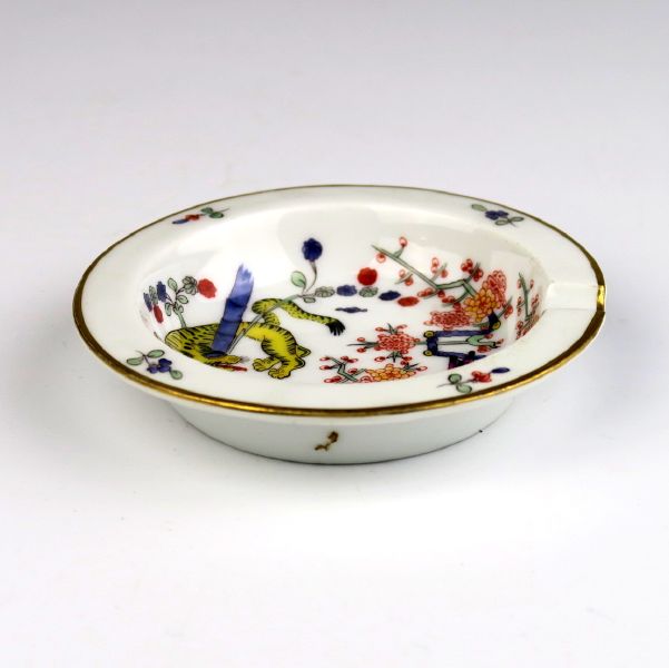 1924 - 1934, Míšeň, porcelán, pestrá malba žlutého lva podle asijských předloh, modrá znača mečů pod glazurou, průměr 9 cm