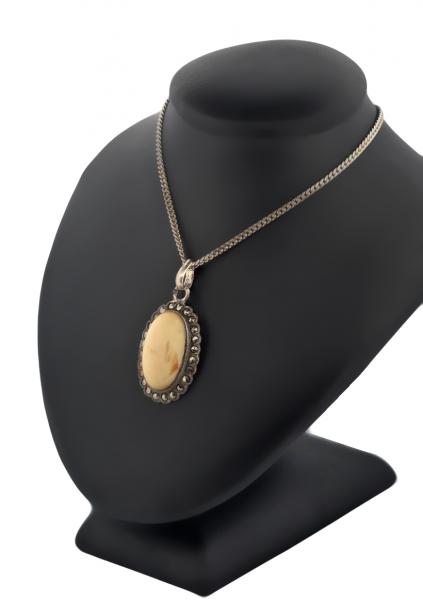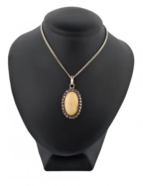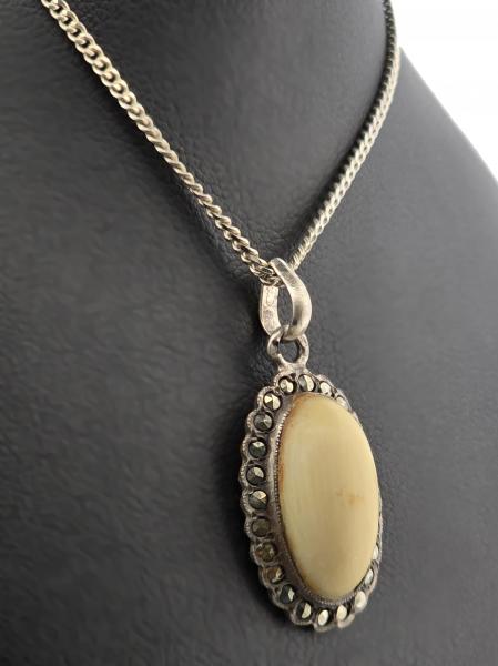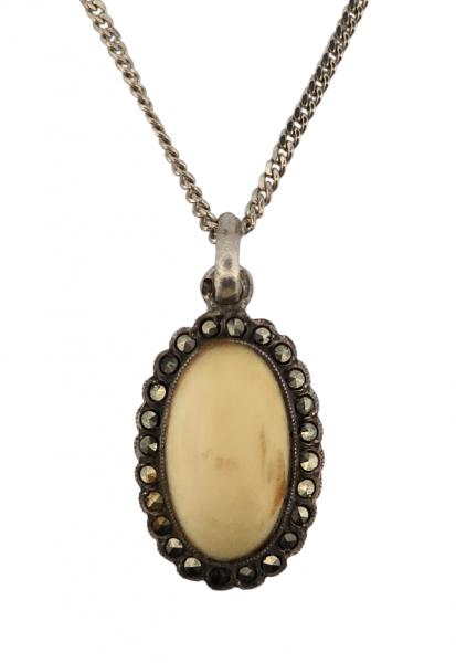 Popis: Stříbrný řetízek s přívěskem ve tvaru oválku z kosti, lemovaný markazity. Zapínání klasické.