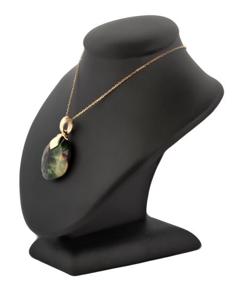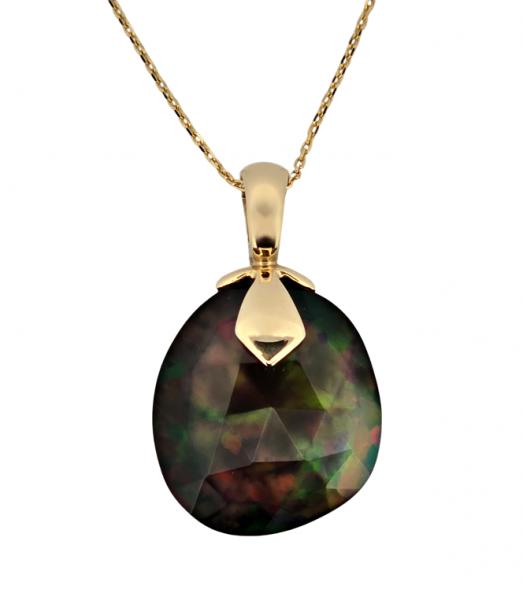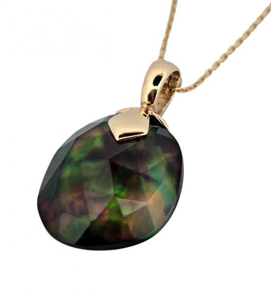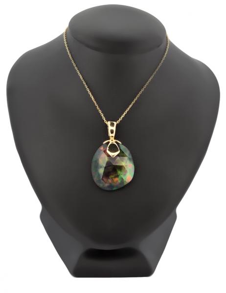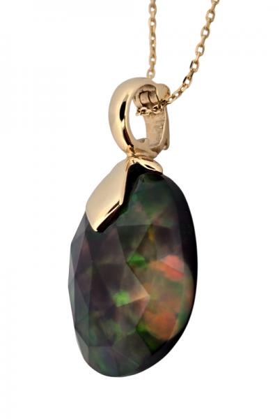 Popis: Zlatý luxusní přívěs s řetízkem. Jedná se o přírodní etiopský opál, nádherně fazetovaný - vybroušené plošky výrazně opaleskují duhovými barvami. Zadní černá strana dobarvovaná chemických procesem. Otevíratelné očko, drží pevně. Zapínání řetízku klasické.