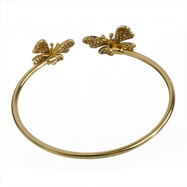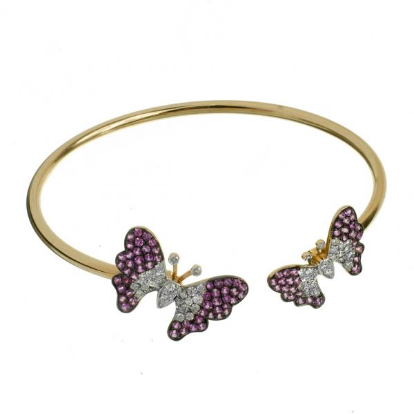 Zlatý náramek zdobený růžovými safíry a brilianty ve tvaru motýlů. Au 750/1000, hmotnost: 8,85g, safíry 1,20 ct, brilianty 0,60 ct. 2. polovina 20. století 6,3x5,8x2,1 cm, šířka obroučky: 0,2cm.