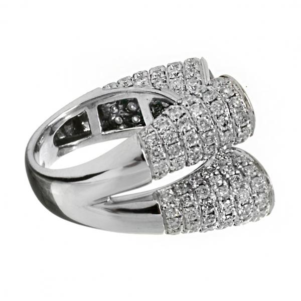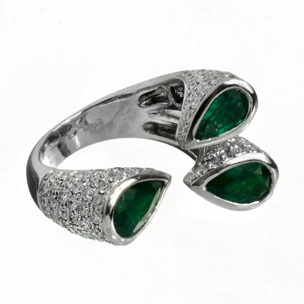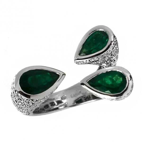 Atypický prsten z bílého zlata zdobený smaragdy a brilianty. Au 750/1000, hmotnost: 11,77g, smaragdy, brilianty o celkové váze 1,50ct. Čechy, 2. polovina 20. století. Velikost prstenu: 55.