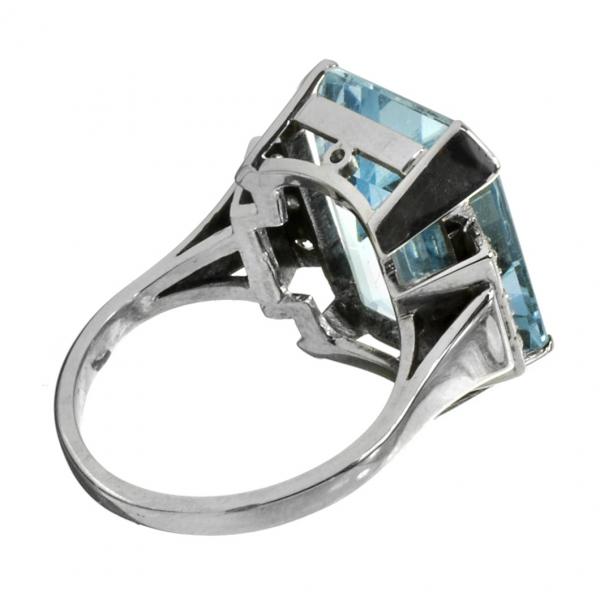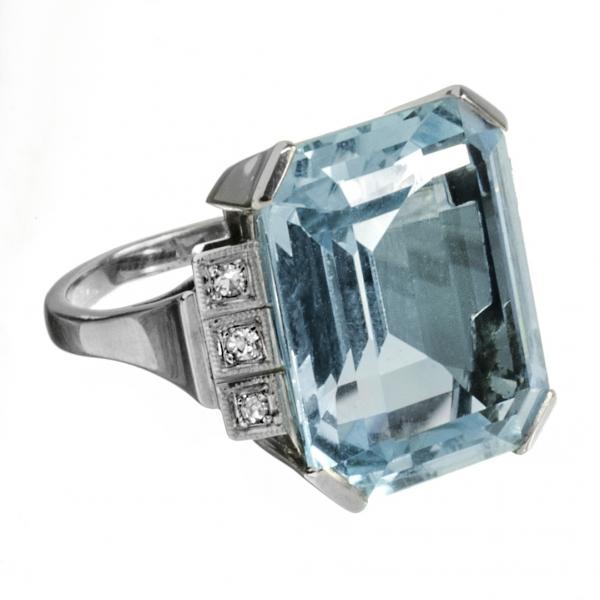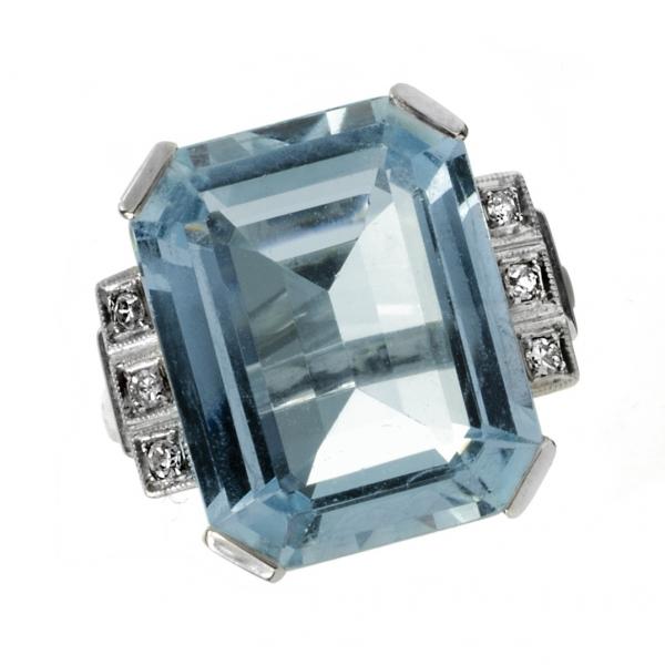 Prsten z bílého zlata zdobený velkým přírodním akvamarínem a brilianty. Au 585/1000, hmotnost: 7,10g, brilianty o celkové hmotnosti 0,15 ct. Čechy, 2. polovina 20, století. Velikost prstenu: 52.