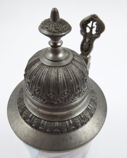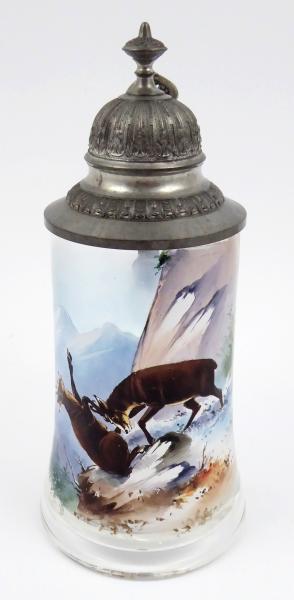 Čiré sklo, ruční malba emailem, cín. Skleněný korbel s cínovým zdobným okružím, úchytem a víkem s ručně barevným emailem malovanou scénou souboje dvou kamzíků na skalnatém výběžku. Nebe uprostřed horských štítů je vybarveno transparentním emailem. Zajímavý sběratelský kousek. Střední Evropa 1880 - 1900. Výška 22,5 cm.