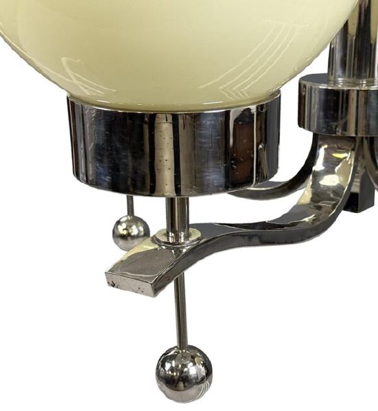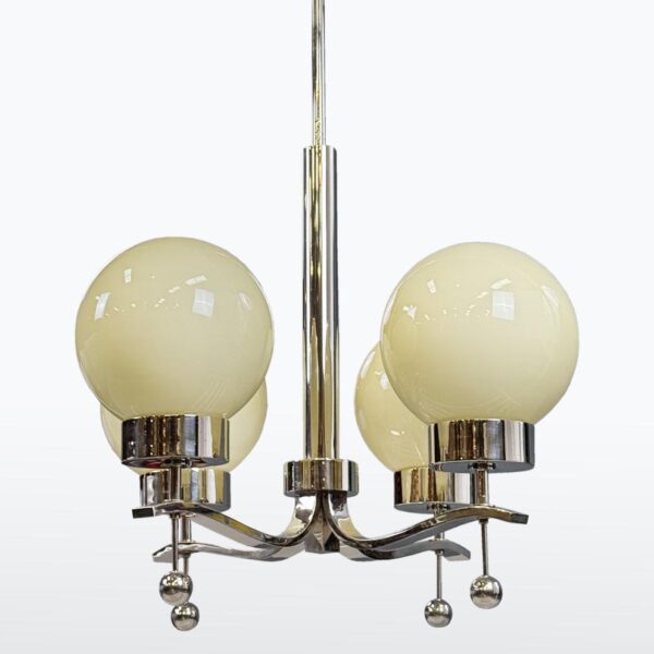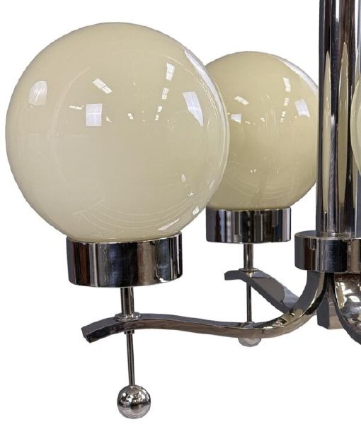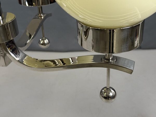 niklovaný kov, opálové sklo, stínidla 4× původní krémové opálové koule, nová elektroinstalace